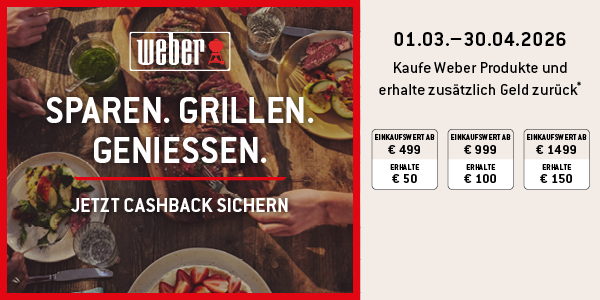 Beim Kauf ausgewählter Weber Grills und Zubehör erhalten Sie jetzt einen attraktiven Cashback‑Betrag zurück – ganz einfach und ohne Aufwand. Kaufbeleg hochladen, Cashback erhalten, genießen!